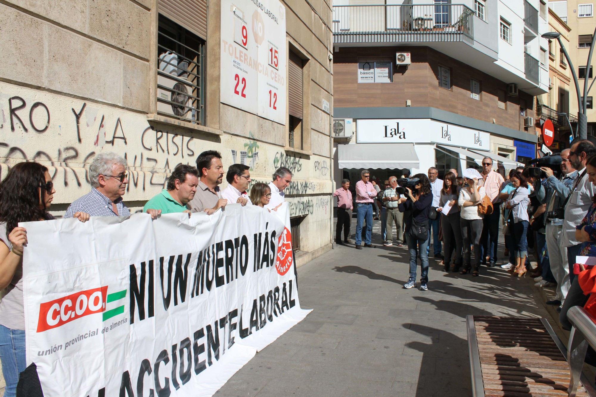 UGT y CCOO Almería se han concentrado hoy ante las puertas del edificio sindical en protesta por el cuarto accidente laboral acaecido en nuestra provincia que se cobró la vida un trabajador, ayer miércoles, 15 de octubre, tras ser golpeado por una bobina de plástico de grandes dimensiones mientras se encontraba trabajando en las tareas de construcción de un invernadero en Campohermoso.